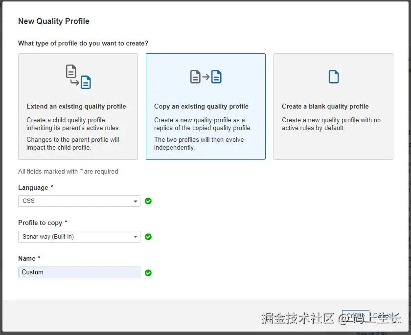 点击页面上的Create按钮,选择Copy an existing quality profile作为创建方式。