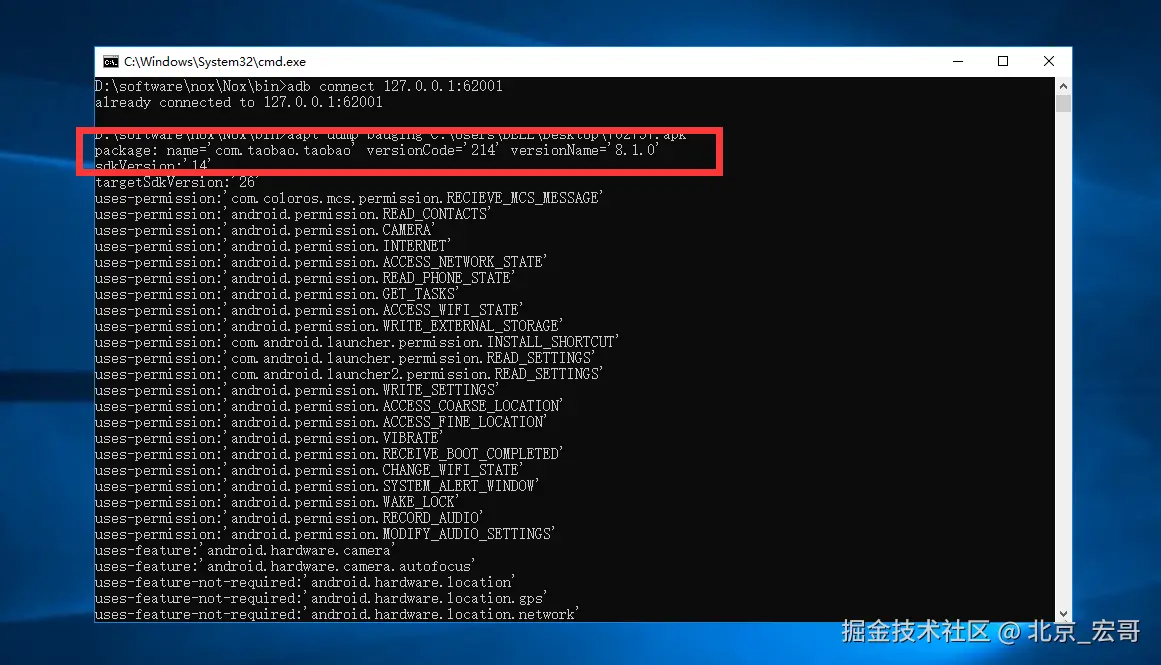 aapt dump badging C:\apps\xxxxx.apk (路径\app包名,也就是安装包在你电脑的位置)