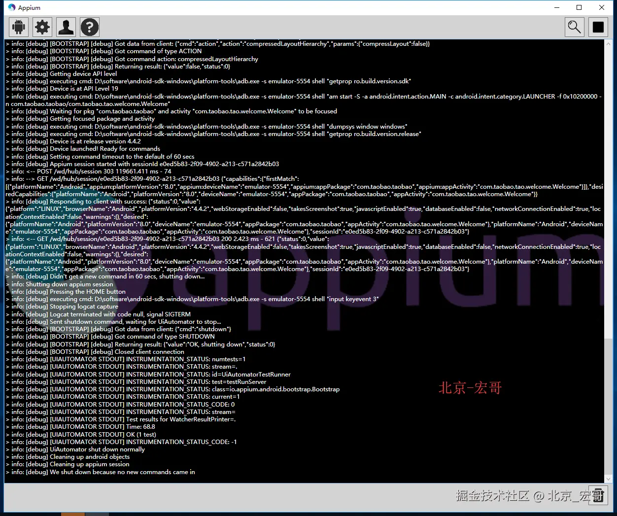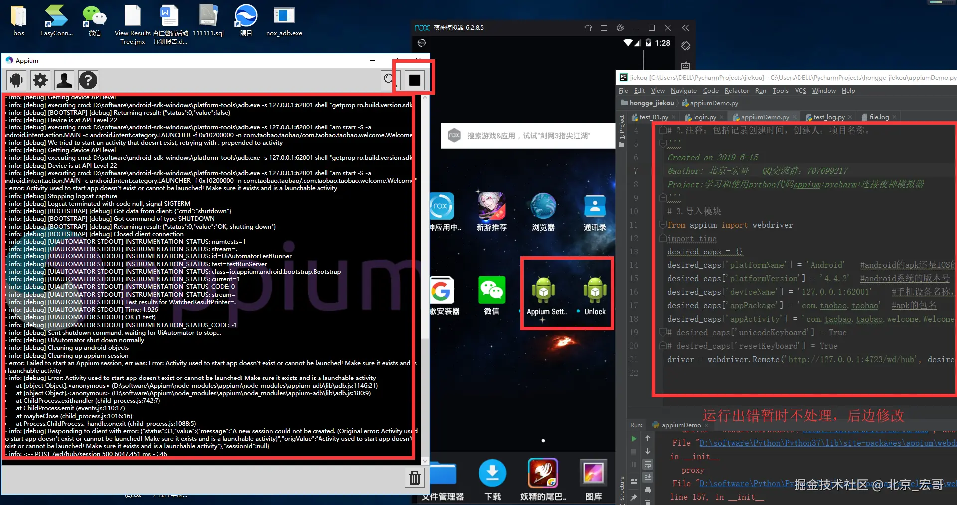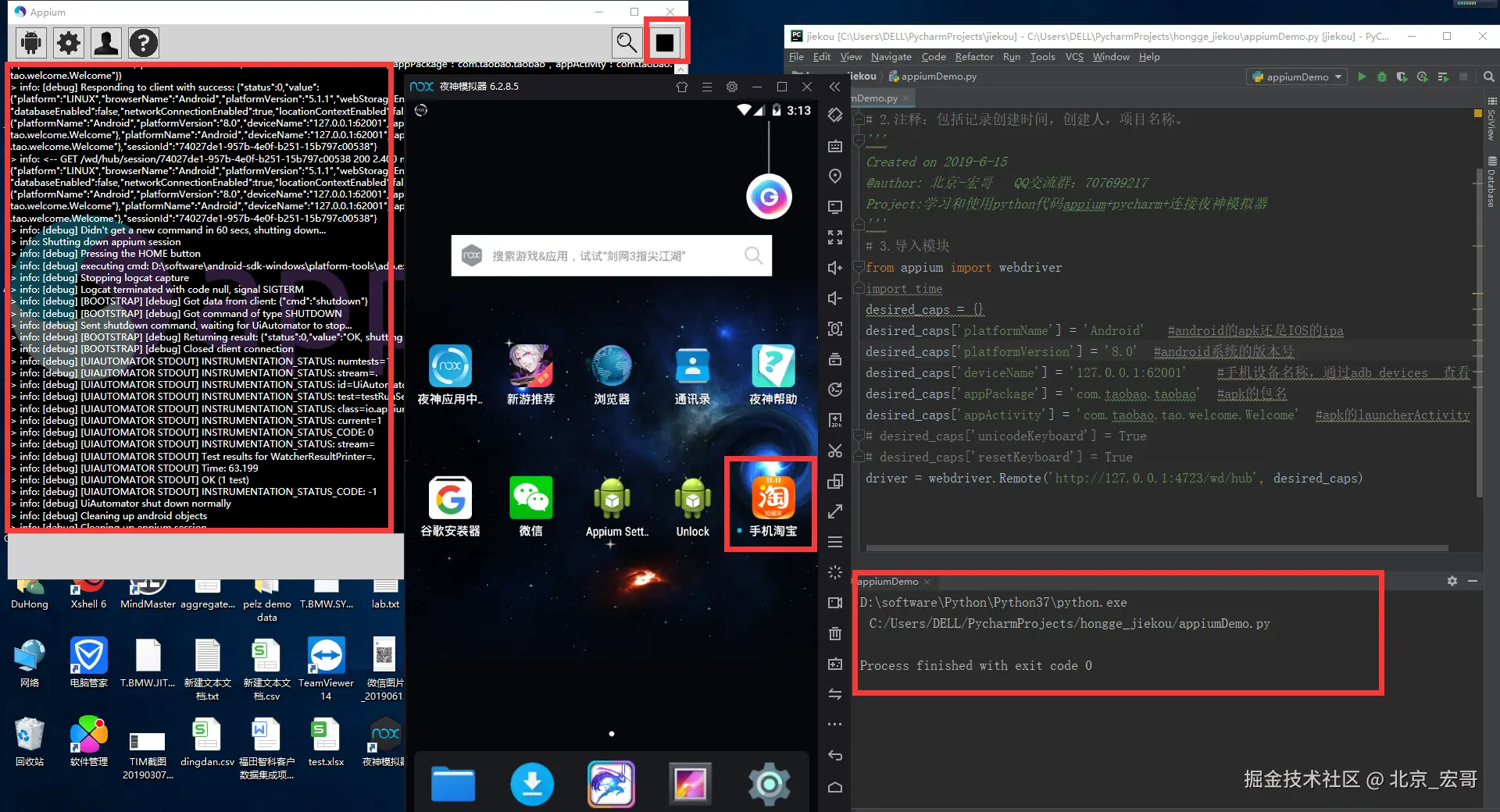 配置好以后,按上边的步骤运行代码,可以看到appium日志没有报错、运行代码没有报错、成功的将淘宝的安装包安装在夜神模拟器上了