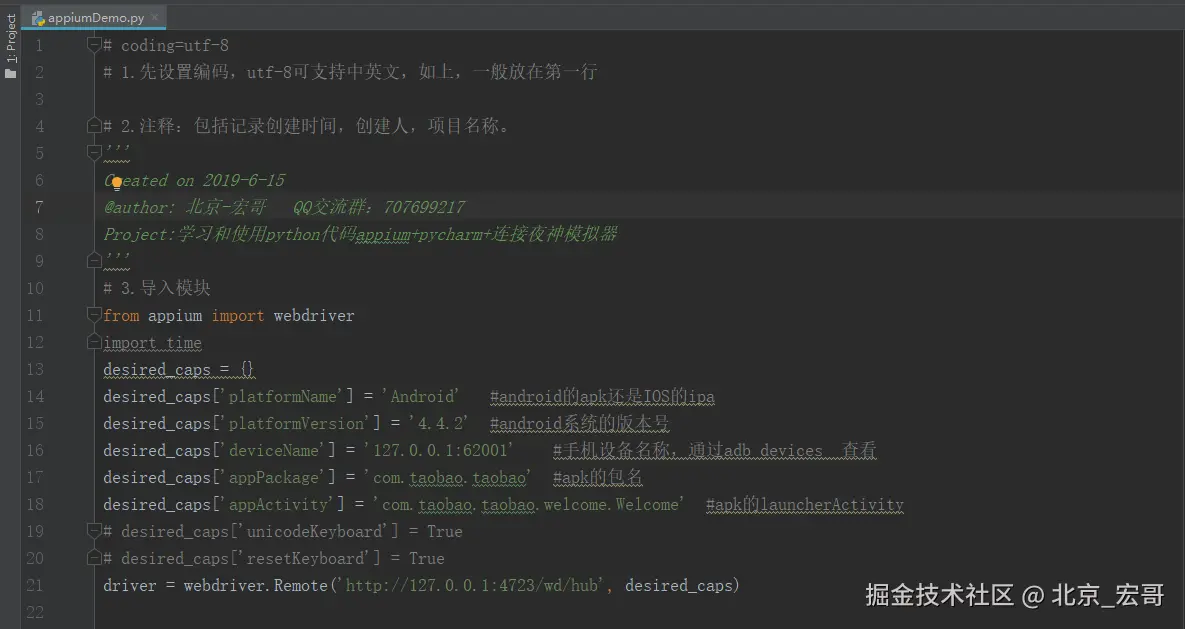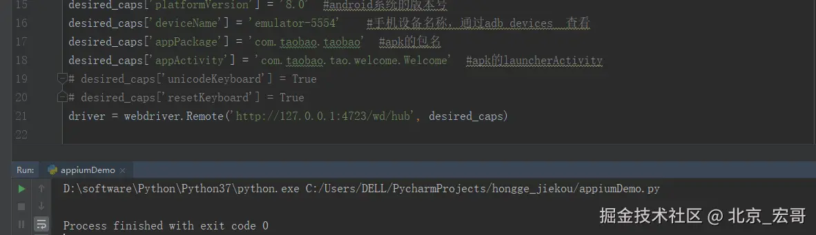 21 driver = webdriver.Remote('http://127.0.0.1:4723/wd/hub', desired_caps) #启动服务器地址,后面跟的是手机信息