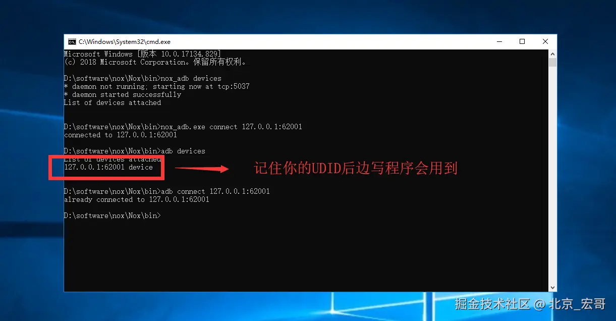 4、打开CMD,进入夜神模拟器的安装路径下:D:\software\nox\Nox\bin,运行指令:nox_adb.exe connect 127.0.0.1:62001和指令adb devices查看设备名,如下图所示