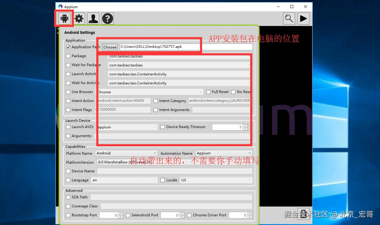 开始运行报错了,最后通过上边的方法查看是因为appActivity错误了,修改版本号和appActivity后还是继续报错,说:安装包不存在,然后在appium中配置