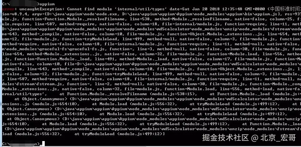 2、遇到的坑1:在CMD指令中输入appium,提示如下图所示