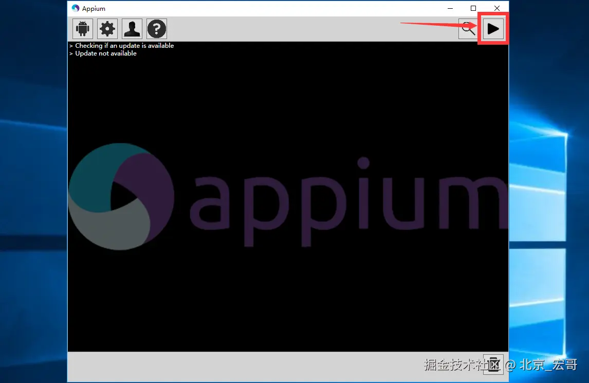 2、打开appium并点击右上角三角符号,如下图所示