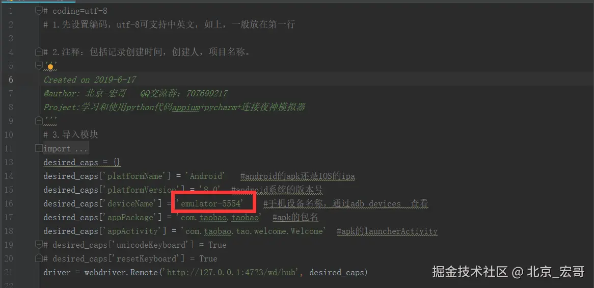 16 desired_caps['deviceName'] = 'emulator-5554' #手机设备名称,通过adb devices 查看