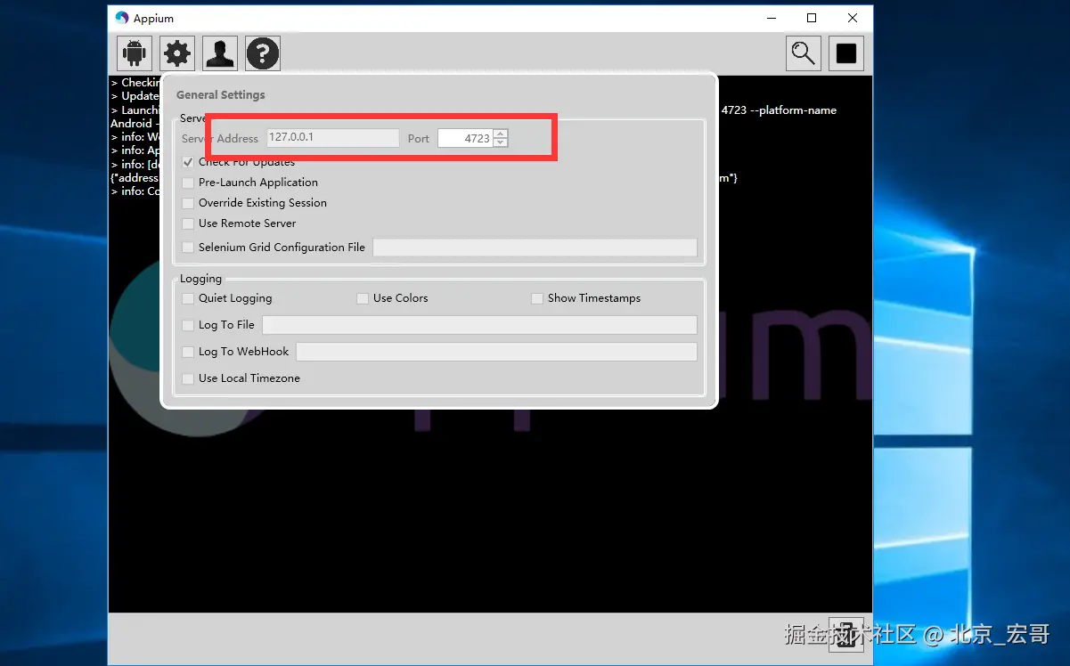 其中|:driver = webdriver.Remote('http://127.0.0.1:4723/wd/hub',desired_caps) #这个地址是怎么来的呢?,见appium设置项,如下图所示
