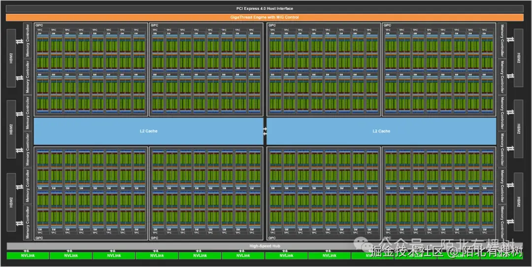 下图是一张英伟达A100的架构图,我们先有一个直观的感受。