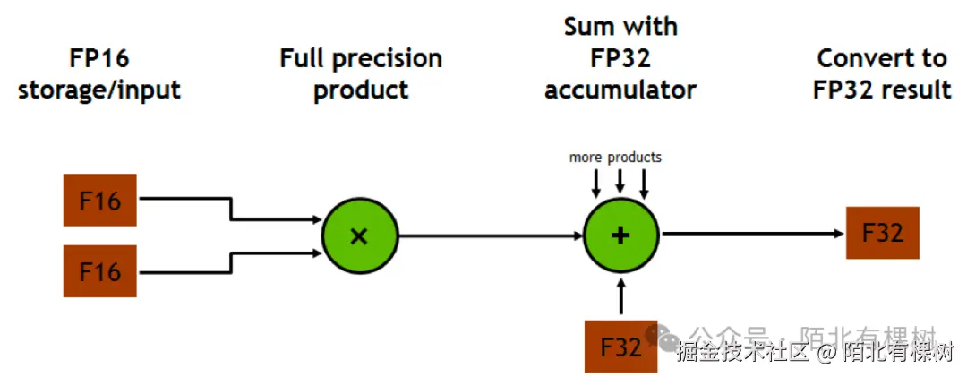 具体来说,相比于 FP32 Core 一次只能对两个数字进行计算,一个Tensor Core可以在一个时钟周期内,完整一个4×4矩阵的乘法和加法运算,矩阵乘法的两个矩阵是FP16,求和的矩阵可以是FP16或FP32。