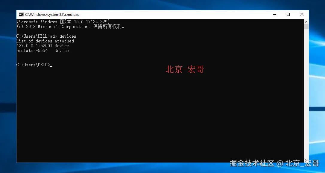 2)启动模拟器,连接模拟器AVD(Google自带),cmd打开命令行窗口,输入adb devices获取到设备的deviceName