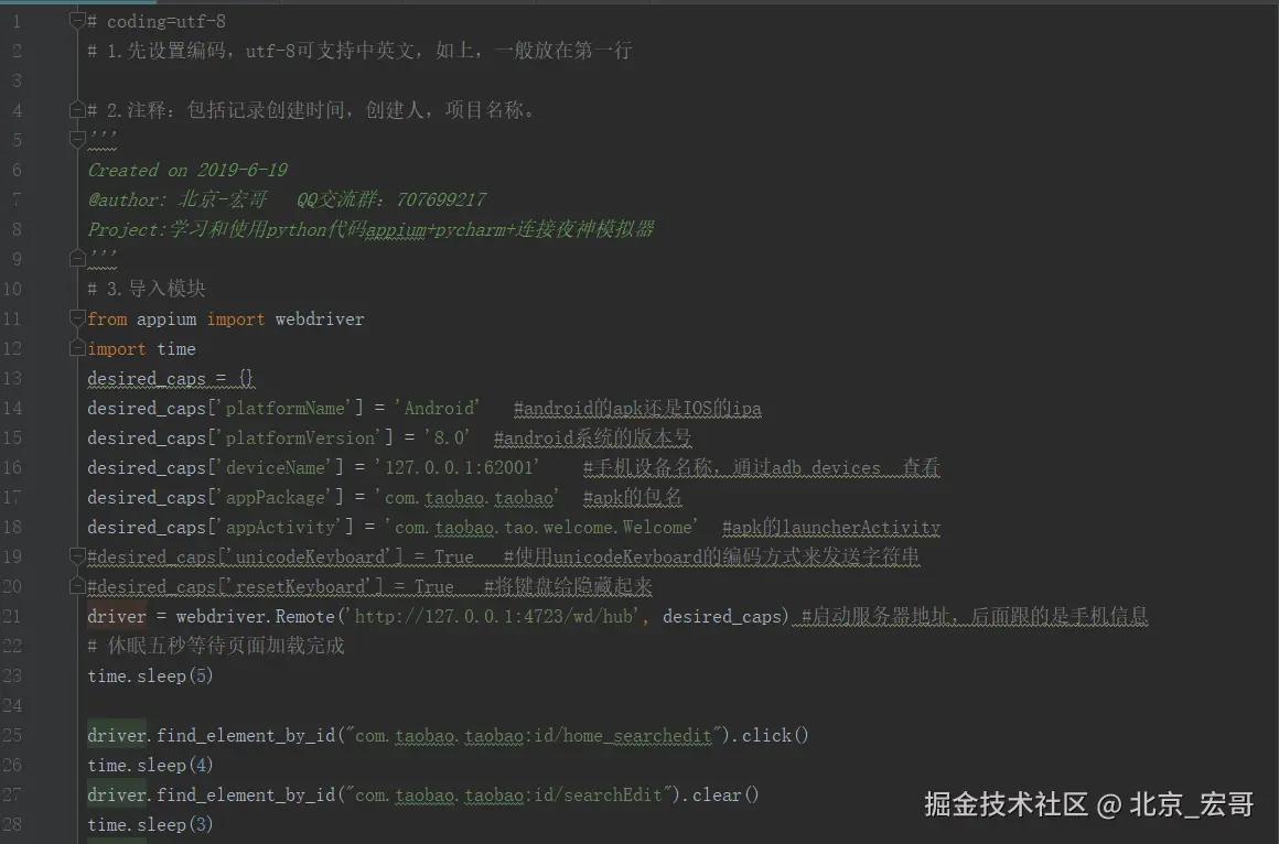 21 driver = webdriver.Remote('http://127.0.0.1:4723/wd/hub', desired_caps) #启动服务器地址,后面跟的是手机信息