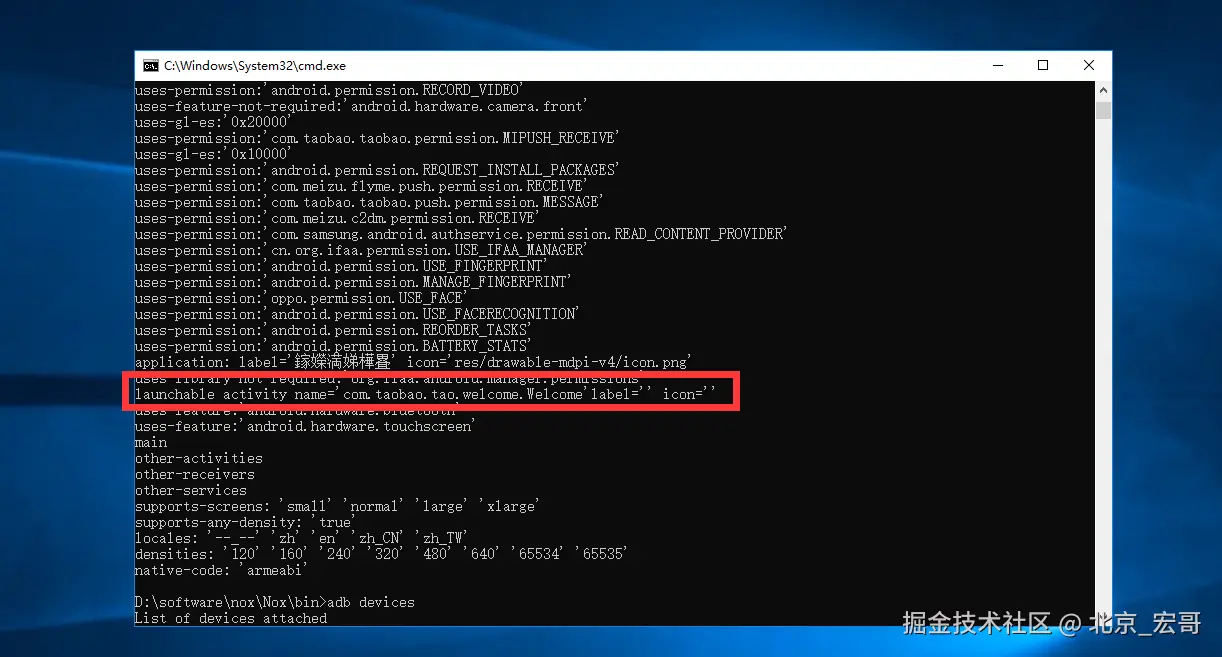 aapt dump badging D:\XXX.apk 获取安装包的所有信息