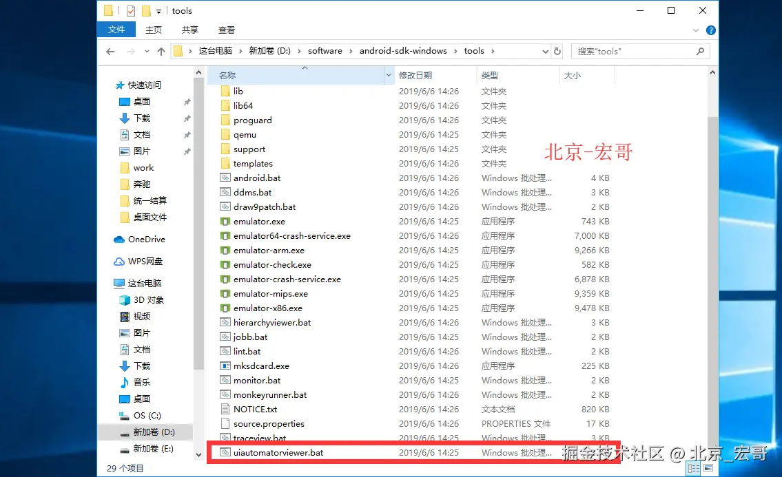 1)启动Android SDK中的一个神器可以查找app的定位元素进行脚本的编写。在Android SDK中的tools中有一个uiautomatorviewer.bat,如下图所示:
