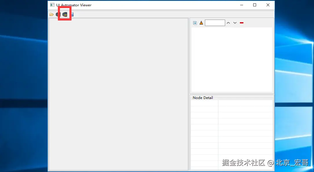 2)点击uiautomatorviewer.bat进行启动,左上角一共四个按钮,作用分别是打开本地文件(open)、Device Screenshot (uiautomator dump)dump页面、dump压缩格式的页面、保存;启动后点击左上角第三个图标进行真机界面的呈现。