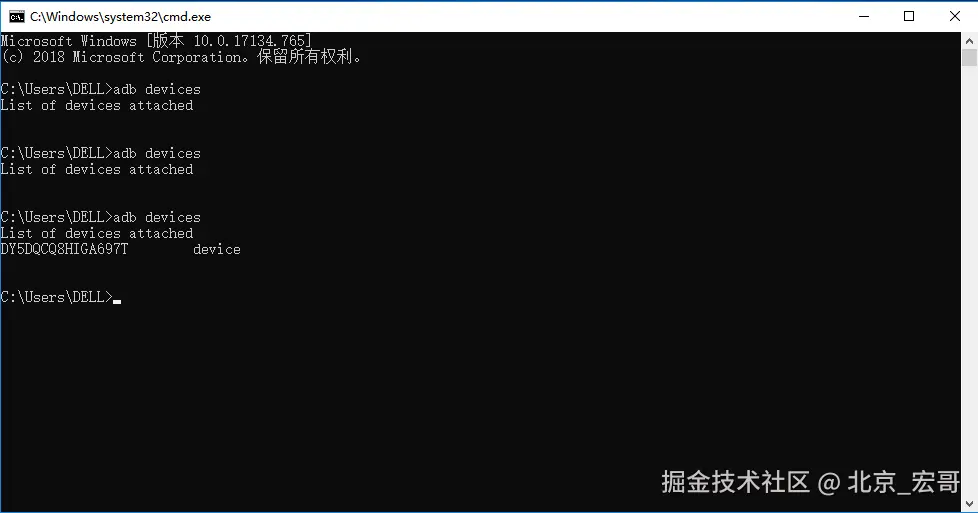 1)连接手机时注意选择手机的开发者模式,cmd打开命令行窗口,输入adb devices获取到设备的deviceName。