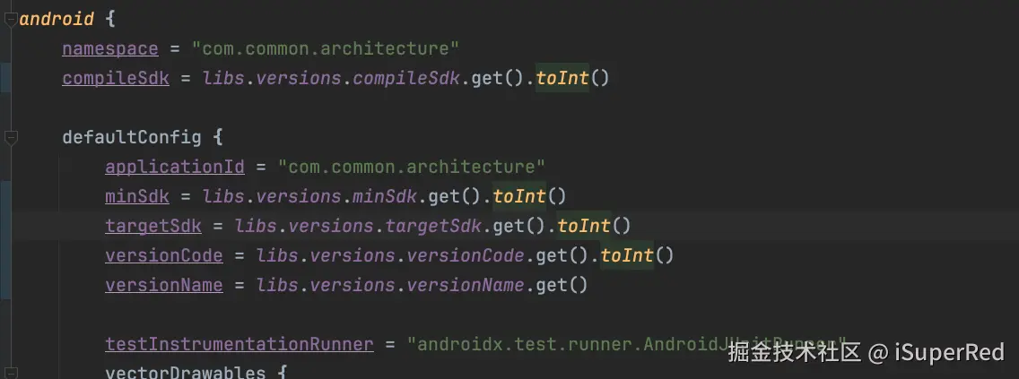 在 libs.versions.toml 文件的 versions 部分添加相应的 minSdk 后,可以在设置 minSdk 时通过 libs.versions.minSdk.get().toInt() 进行引用。类似地,其他如 compileSdk、targetSdk 等也可以使用同样的方法进行引用,如下所示。