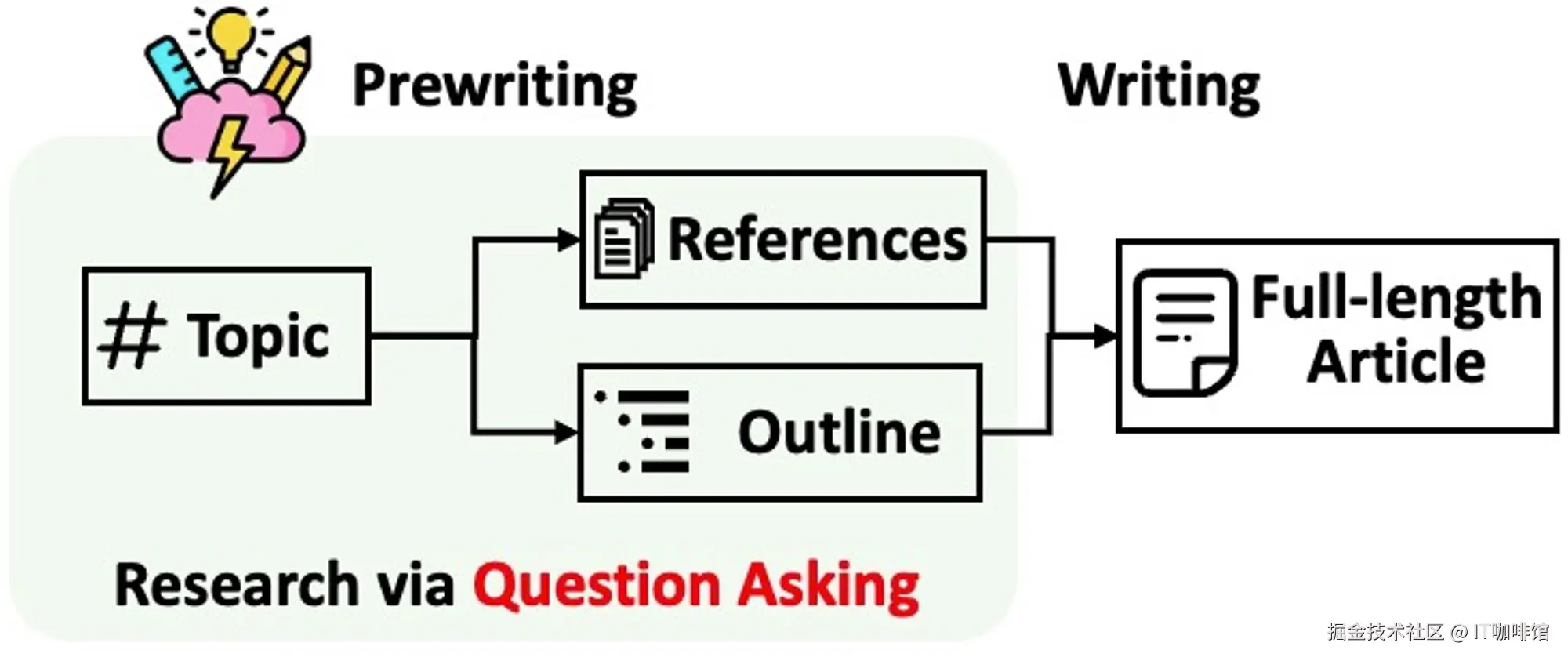 - 写作前阶段:系统进行基于互联网的调研,收集参考资料并生成提纲。