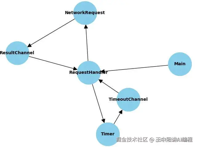 这个图示展示了并发请求处理系统的工作流程,通过 goroutine 和 channel 实现异步请求处理和超时控制,使得主程序可以并发处理多个请求并处理超时情况。