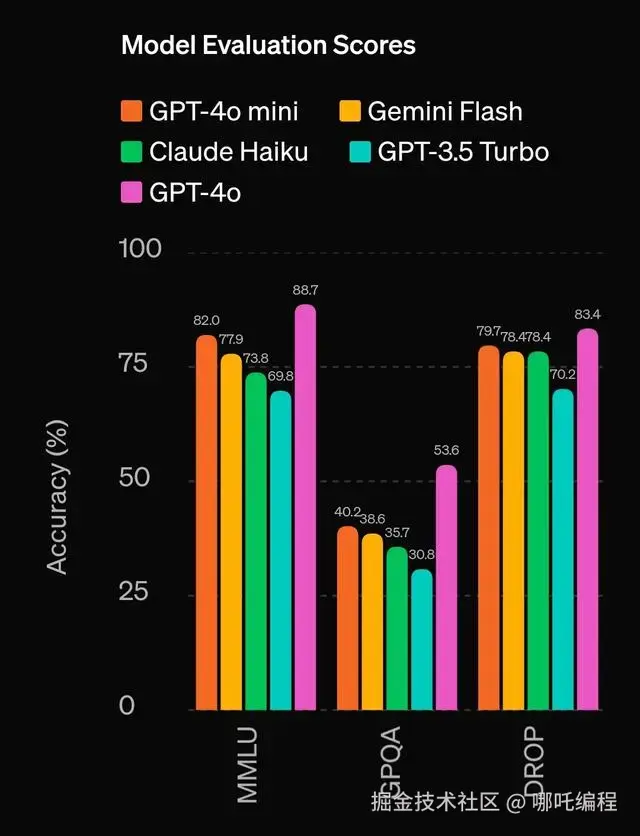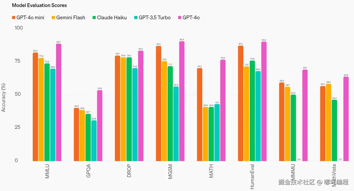 多模态推理:GPT-4o mini在多模态推理评估MMMU中也表现出色,得分为59.4%,而Gemini Flash为56.1%,Claude Haiku为50.2%。
