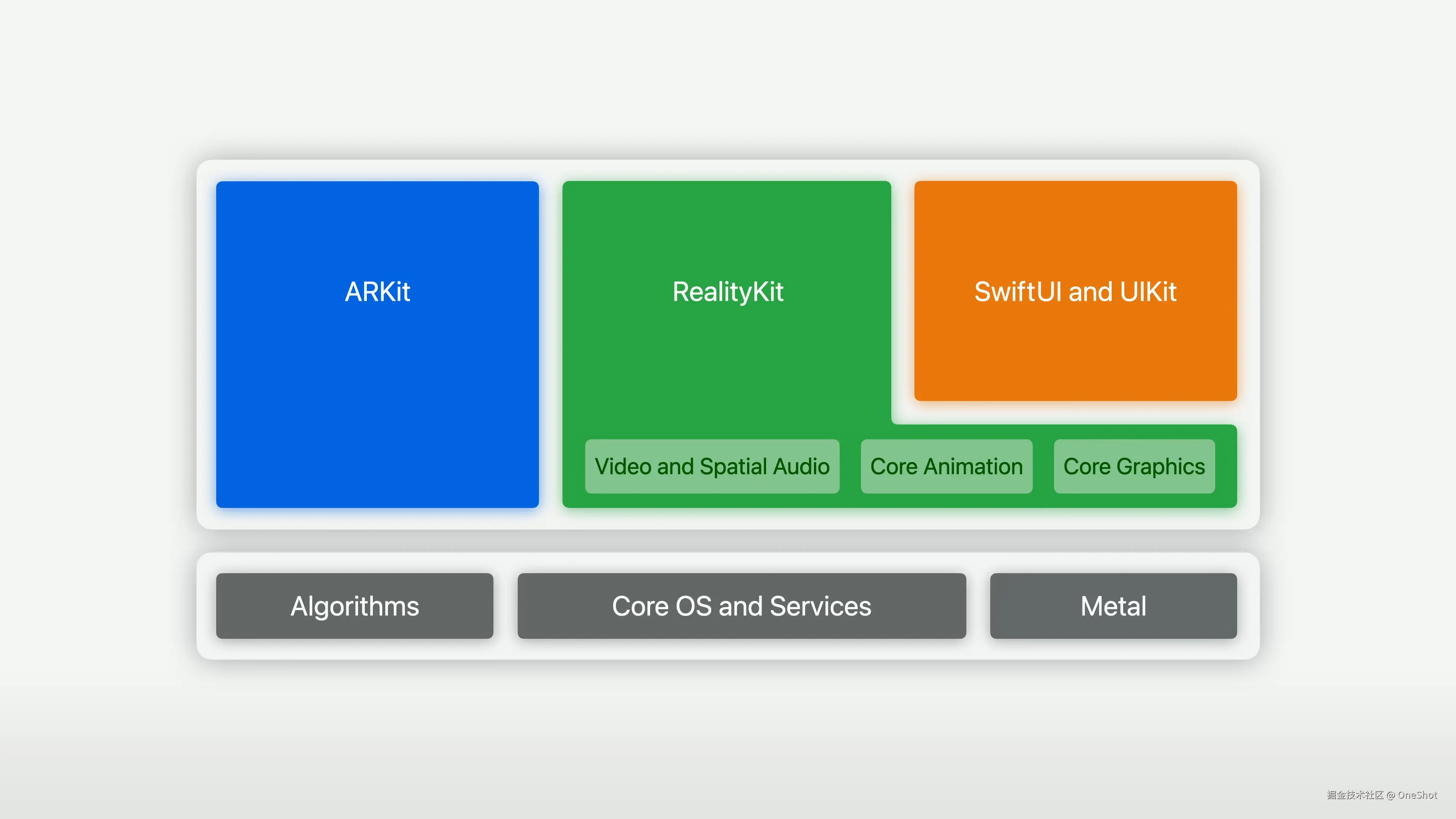 下图是 visionOS 依赖库架构图,可以看出,ARKit、RealityKit、SwiftUI、UIKit 以及底层核心库等,共同支撑了 visionOS 整个空间计算的能力。