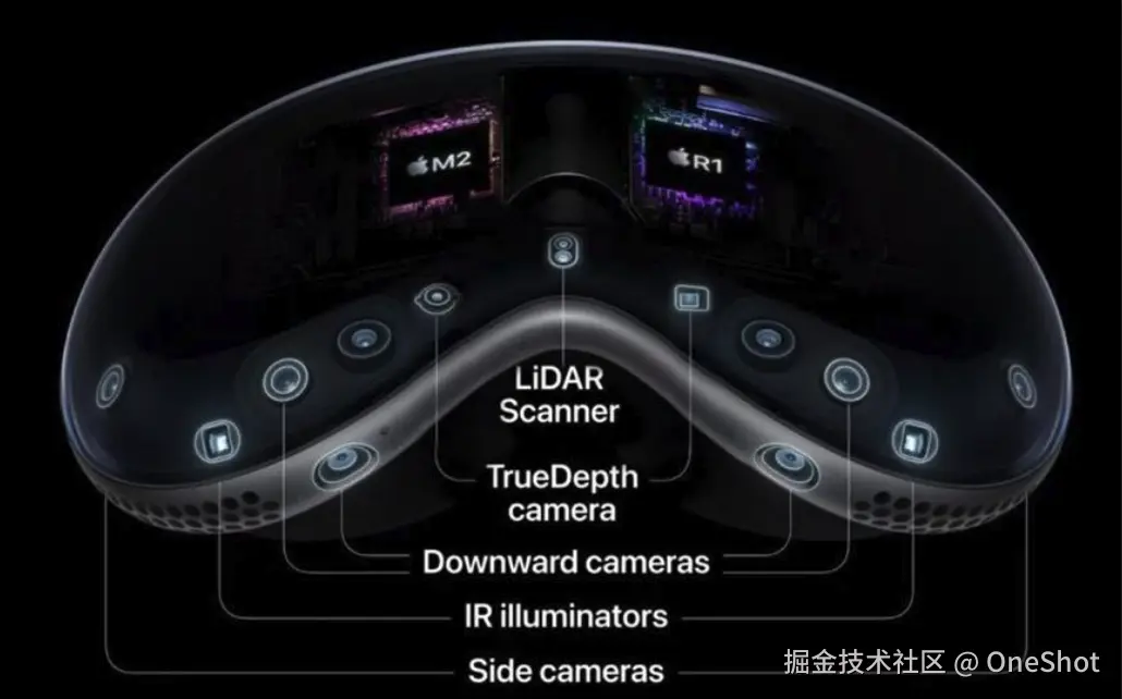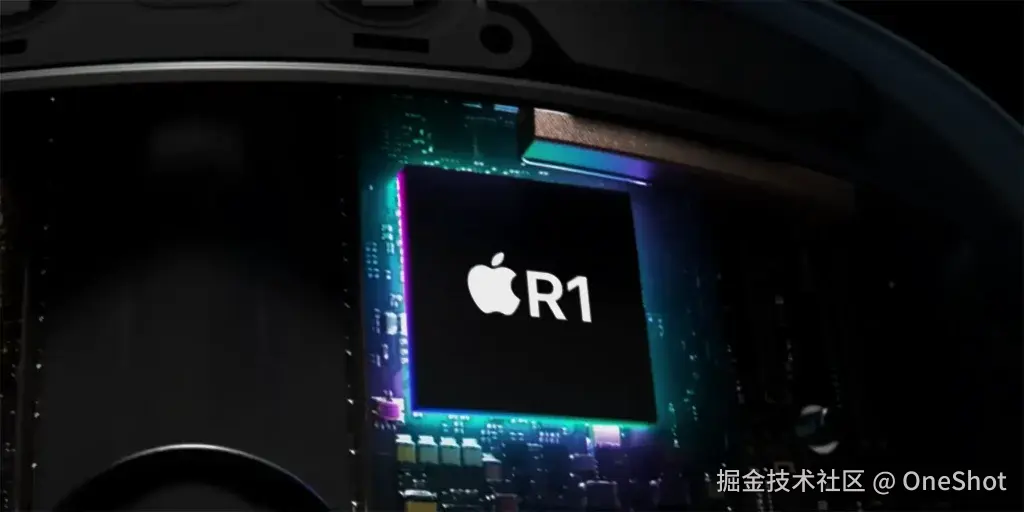 为了将所有这些摄像头、传感器和麦克风的输入融合在一起,Apple 开发了一款名为 R1 的定制芯片。R1 芯片具有 256GB/s 的内存带宽,超过任何其他移动芯片,Apple 声称它几乎消除了延迟,在 12 毫秒内将新图像传输到显示器”,这与高通声称的 Snapdragon XR2 Gen 2 头显的延迟相同就像 Meta Quest 3 一样。