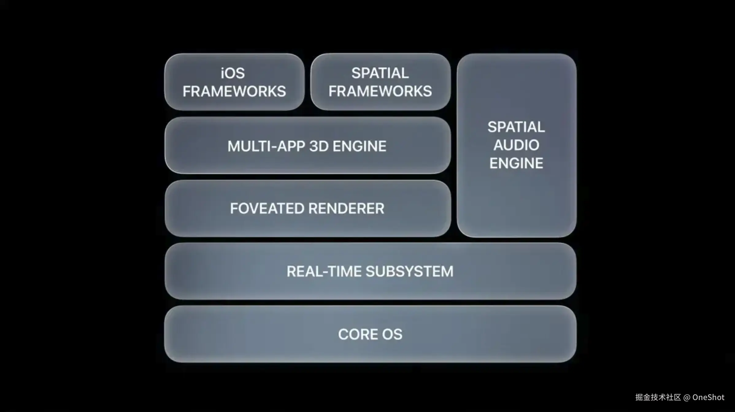 “一个全新的平台;熟悉的架构和工具”,是因为 visionOS 是建立在 macOS、iOS 和 iPadOS的基础上。它们共享一套底层核心模块,并增加了一个 “实时子系统 (real-time subsystem)” 用于在 Apple Vision Pro 上处理交互式视觉效果。