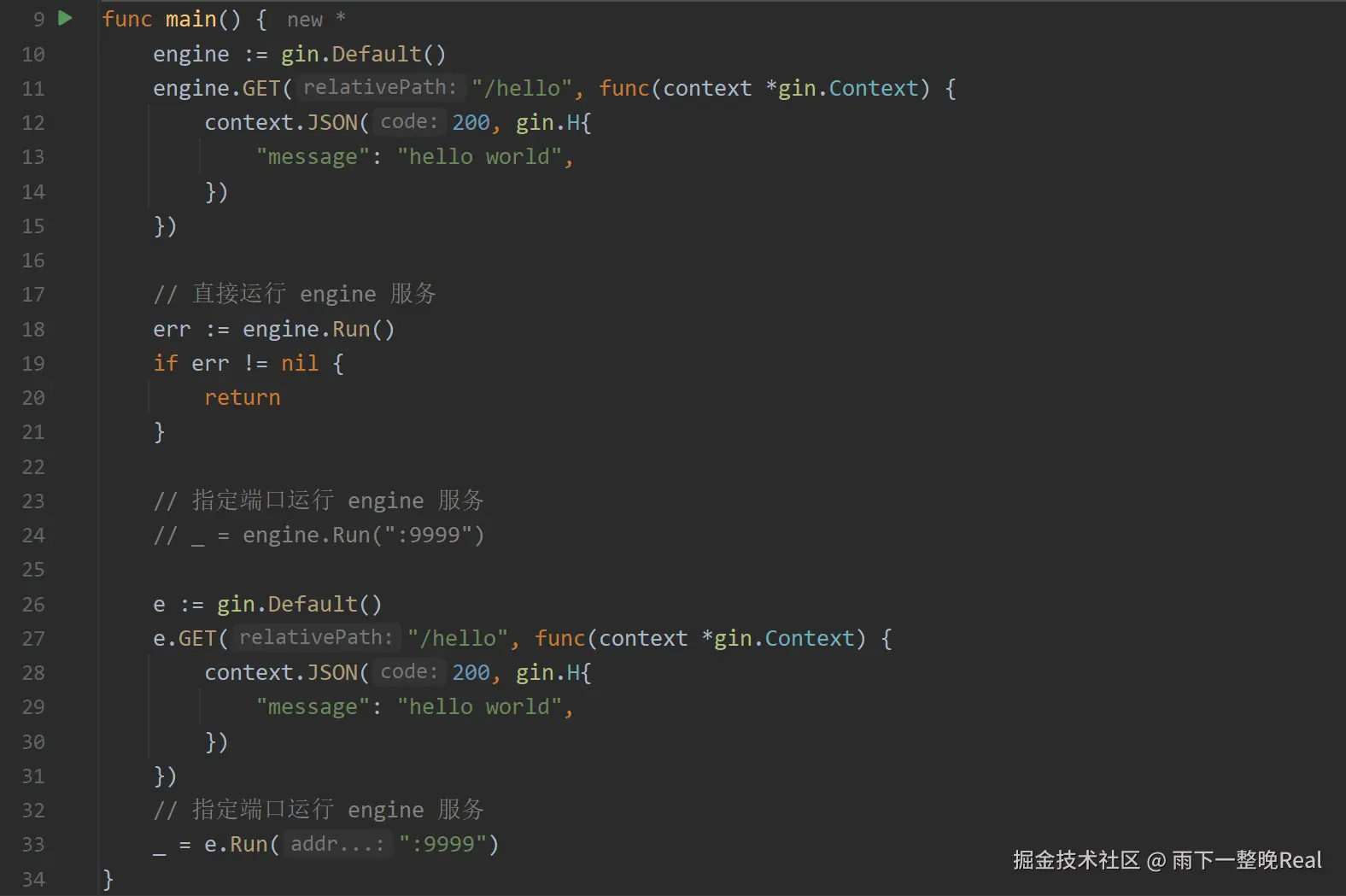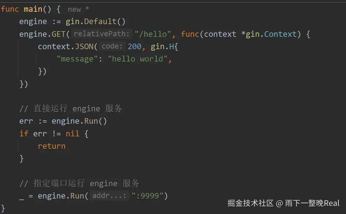 engine.Run()函数来让应用运行在本地服务器上,默认监听端口是 8080,可以传入参数设置端口,例如engine.Run(":9999")即运行在 9999 端口。