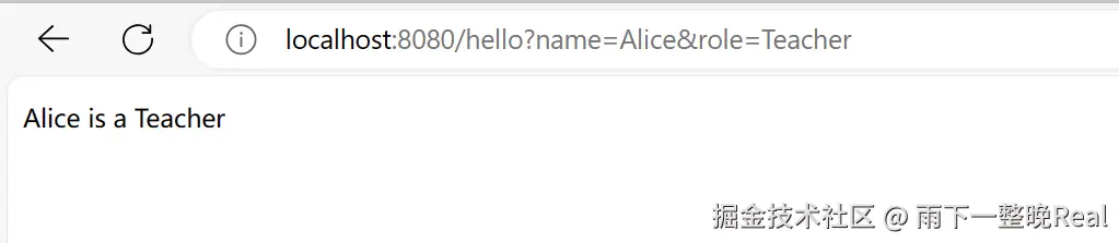 启动之后,访问 [**http://localhost:8080/hello?name=Alice&role=Teacher**](http://localhost:8080/hello?name=Alice&role=Teacher)** **地址,可以看到输出的结果,符合我们的预期。