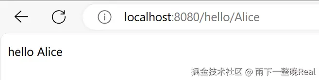 浏览器访问 [**http://localhost:8080/hello/Alice**](http://localhost:8080/hello/Alice)** **可以看到浏览器的输出结果: