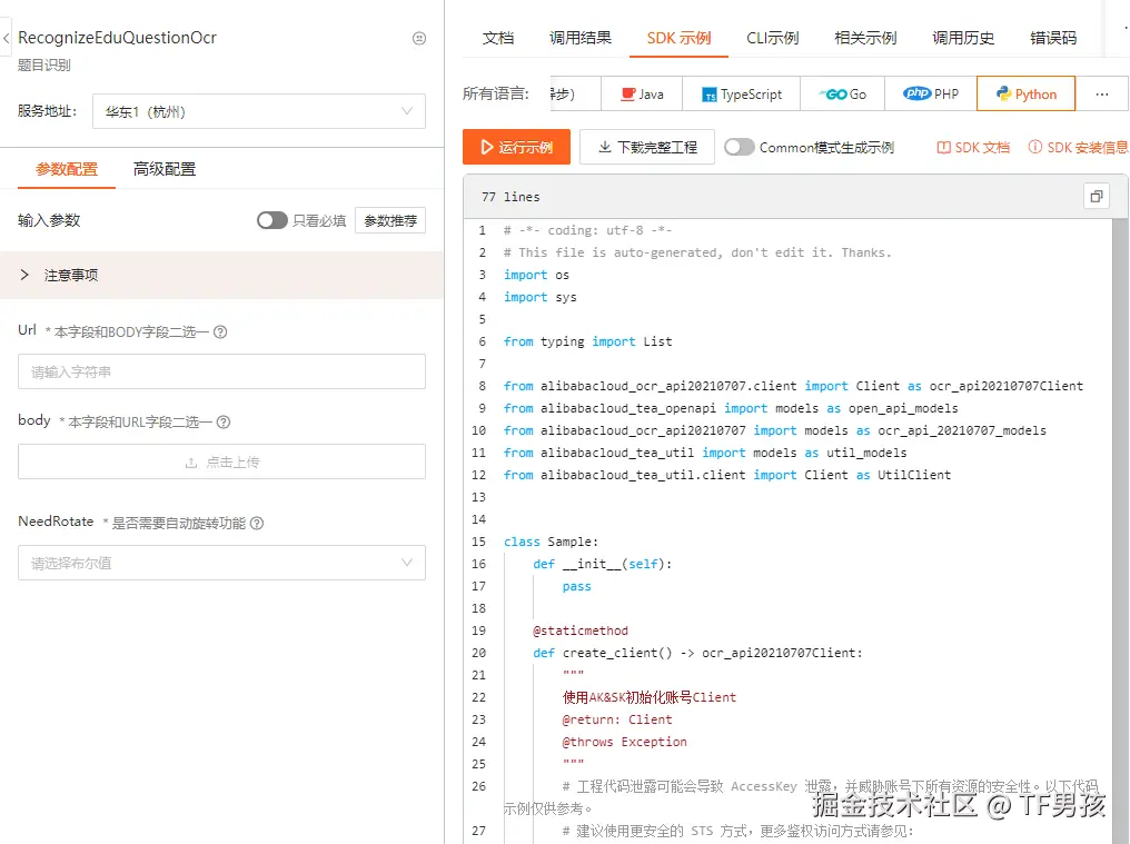 拿着AccessKey就可以调用服务了。关于调用的代码,官方也提供了详细的文档和示例: