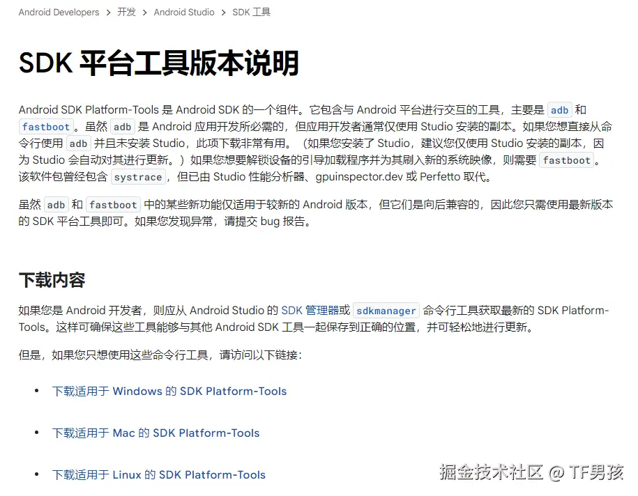 不过,想要执行adb命令,需要一些工具支持。因此得去如下地址下载platform-tools这套工具:
