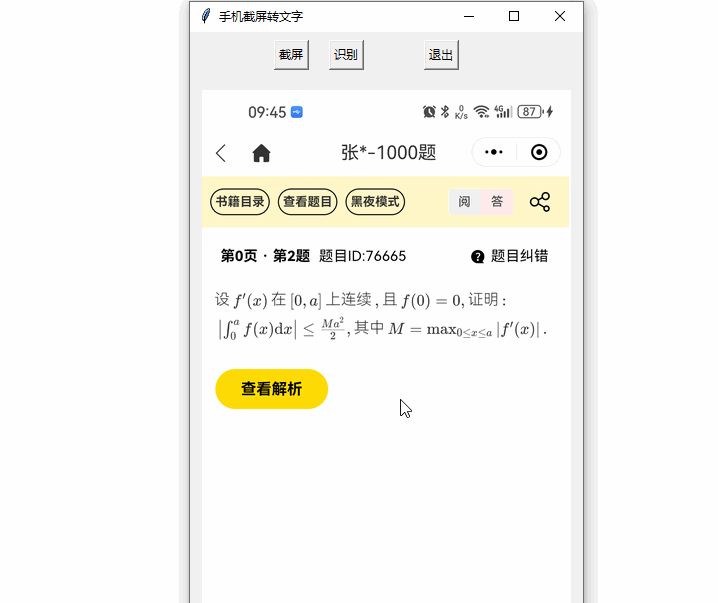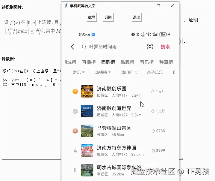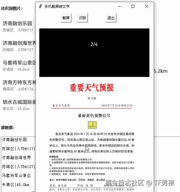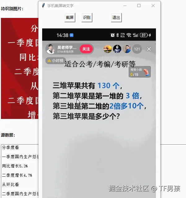 今天要讲的这个技术方案,能用到人会觉得真有用,用不到的人会觉得真没用。这个方案就是采用python实现将安卓手机屏幕上的部分内容转为文字。效果如下:
