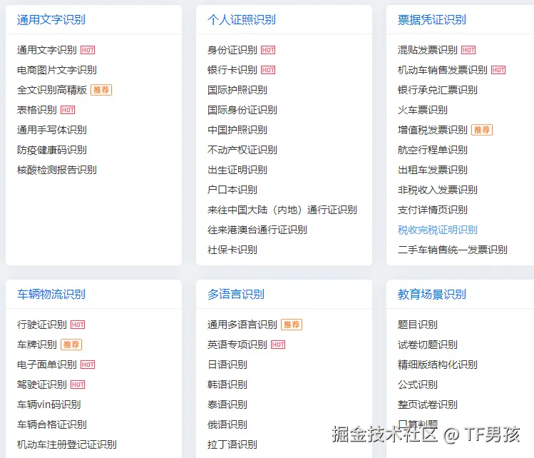 我们这次要识别的内容,不但包含中英文、甚至还有公式。那这必须要使用第三方。第三方OCR服务多了去了,基本上每家都有,我们随便选一家就好。就比如阿里的OCR。