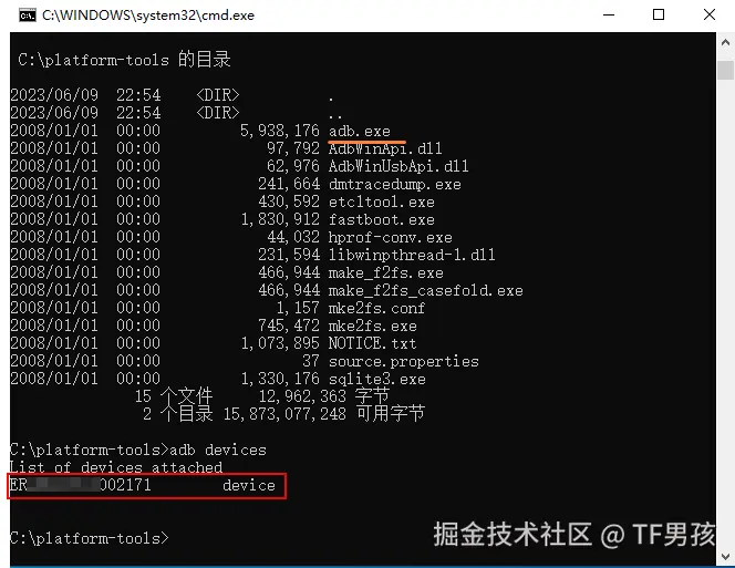 下载解压之后,可以先测试一下。将安卓手机插上数据线,打开允许USB调试模式。然后进入解压目录,我的是放在C盘根目录下,运行adb devices就可以看到已连接的手机情况。