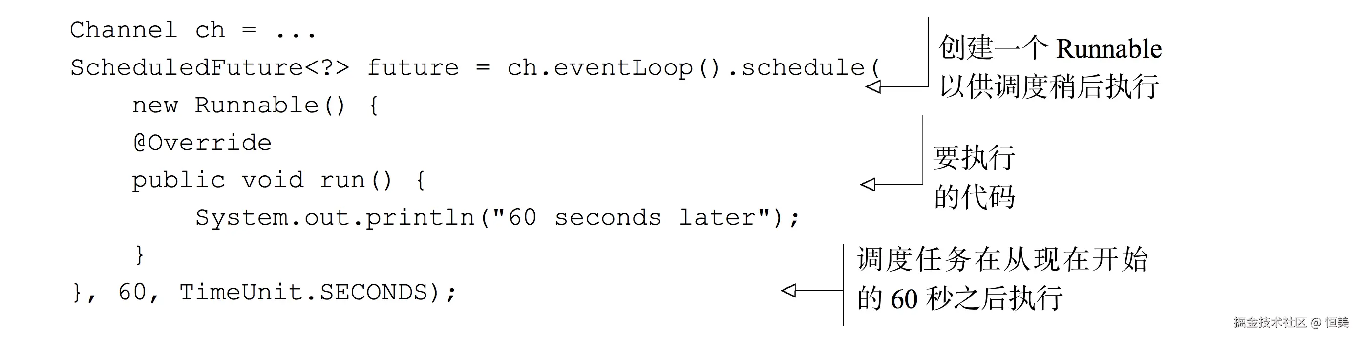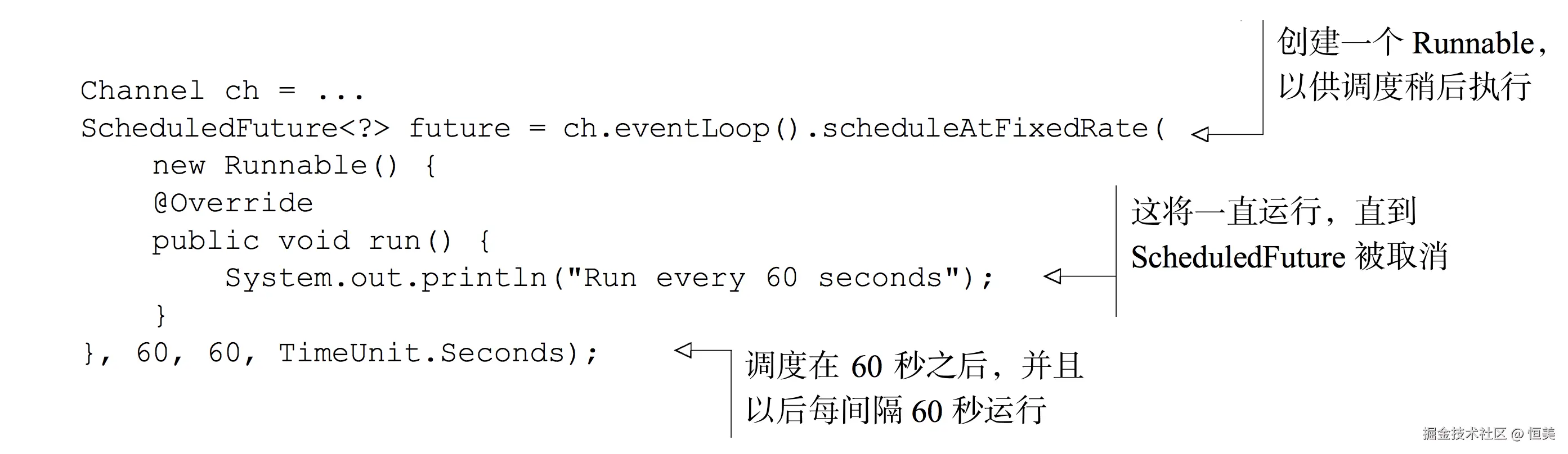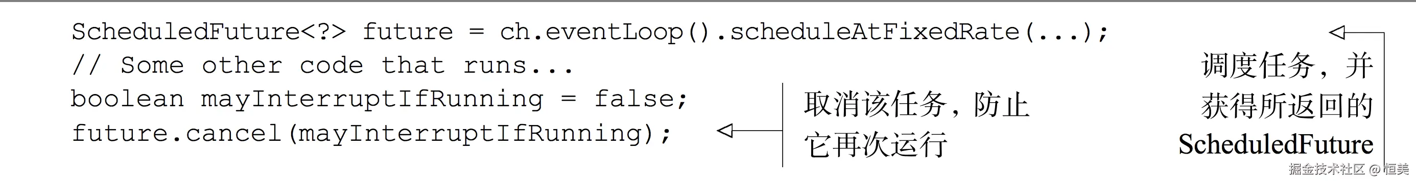 EventLoop继承于ScheduledExecutorService,所以也提供了JDK实现的所有方法,包括之前的schedule()和scheduleAtFixedRate()。 要想取消或检查被调度任务的执行状态,可使用每个异步操作所返回的 ScheduledFuture,
