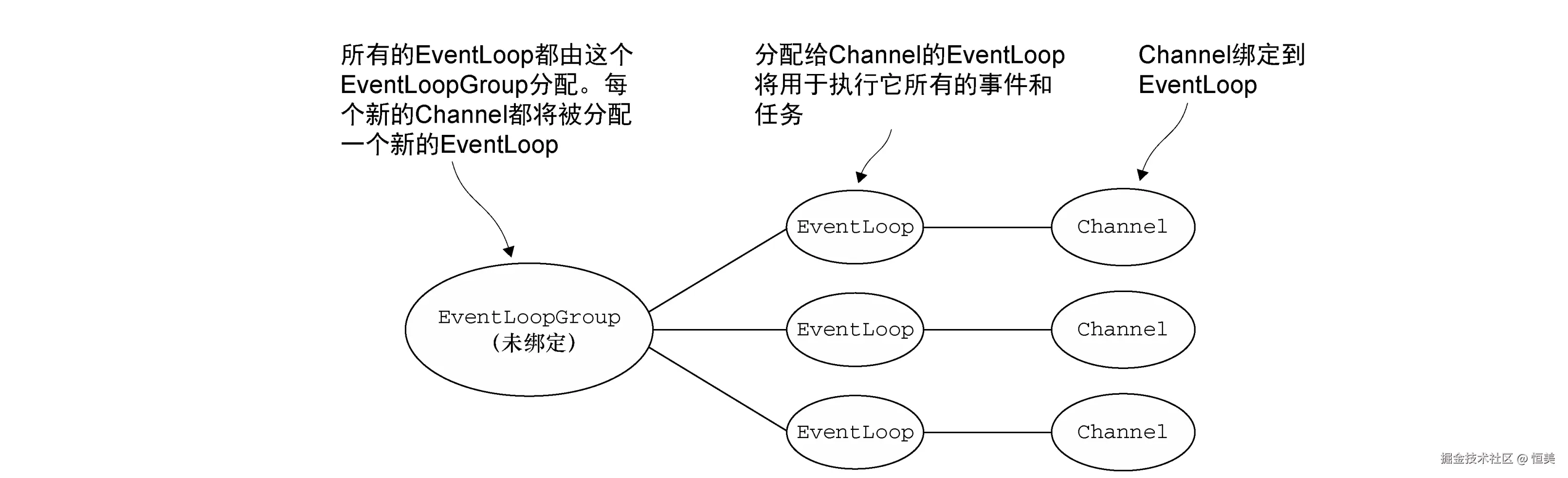 EventLoopGroup 负责为每个新创建 Channel 分配一个 EventLoop。 当前实现中使用顺序循环(round-robin)分配均衡分布,并且相同 EventLoop可能会被分配给多个 Channel。(这点在将来版本中可能变)。