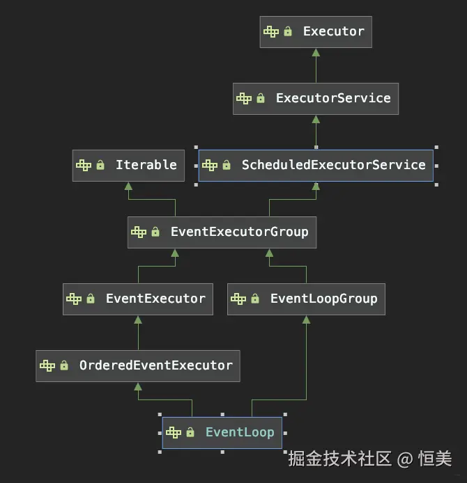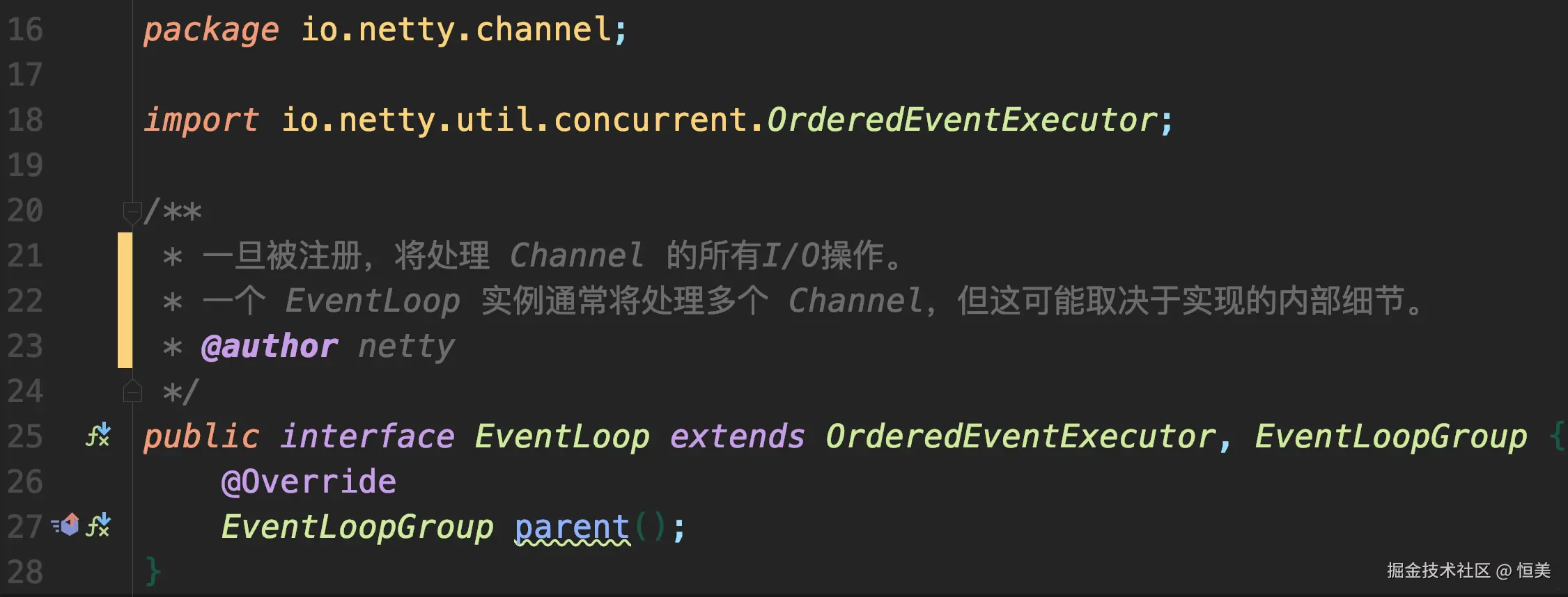 EventLoop继承ScheduledExecutorService时,只定义了一个方法 parent() (重写 EventExecutor 的 EventExecutorGroup#parent())。