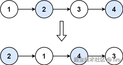 给你一个链表,两两交换其中相邻的节点,并返回交换后链表的头节点。你必须在不修改节点内部的值的情况下完成本题(即,只能进行节点交换)。