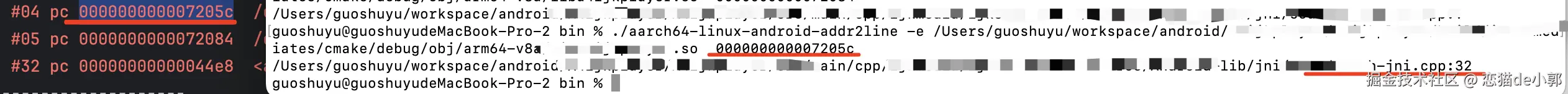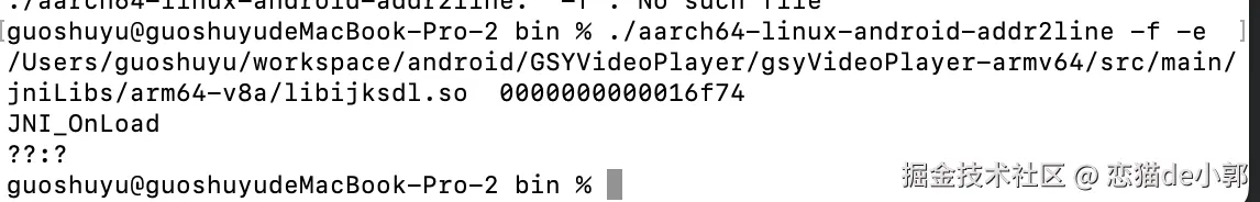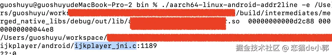 ./aarch64-linux-android-addr2line -e /Users/guoshuyu/workspace/android/··········/build/intermediates/merged_native_libs/debug/out/lib/arm64-v8a/????.so 000000000007e0a0