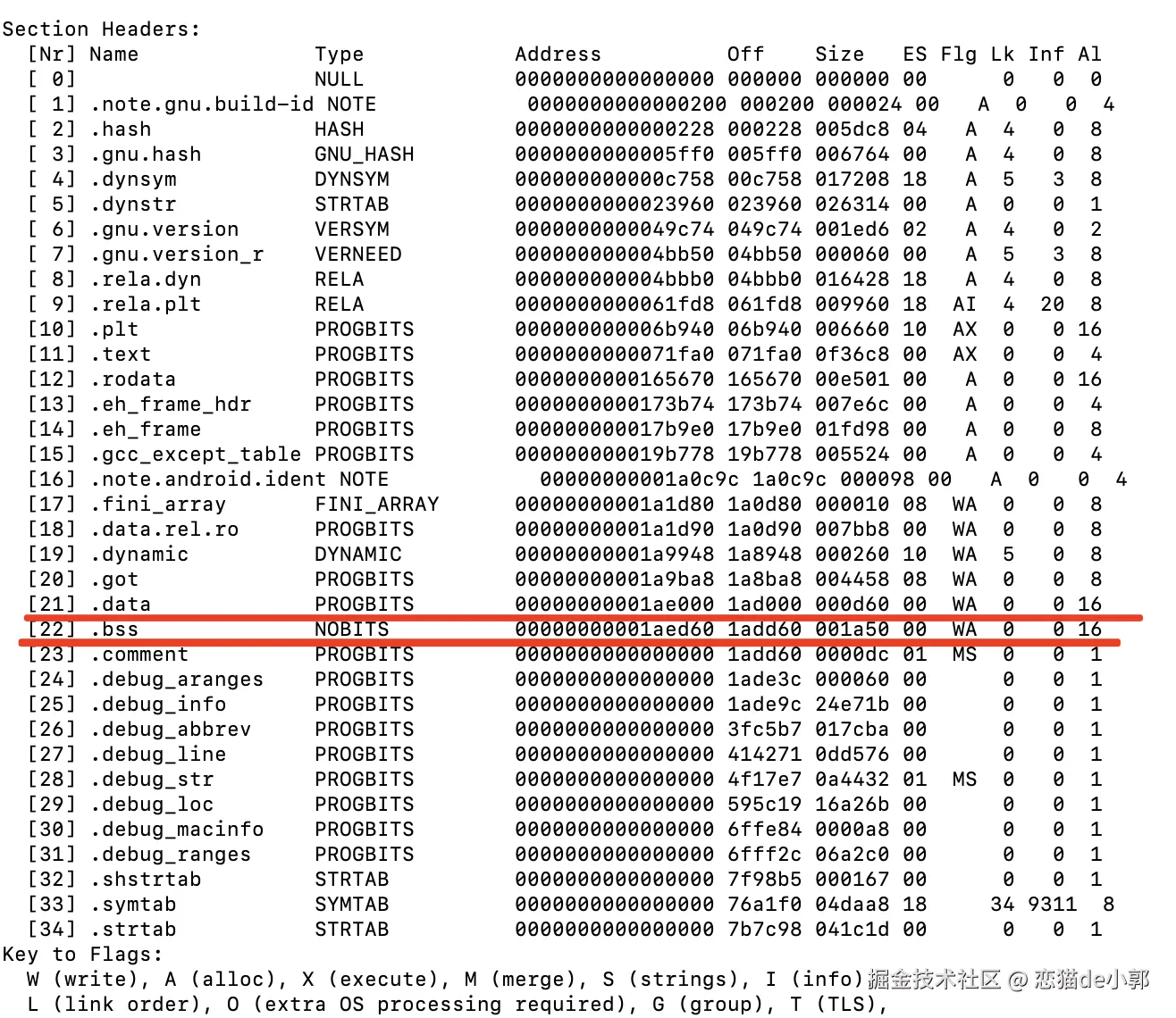 但是从输出看,貌似也没什么问题,如果从另外的 .text 和 .rodata 的 Address 上看也没看出什么问题。
