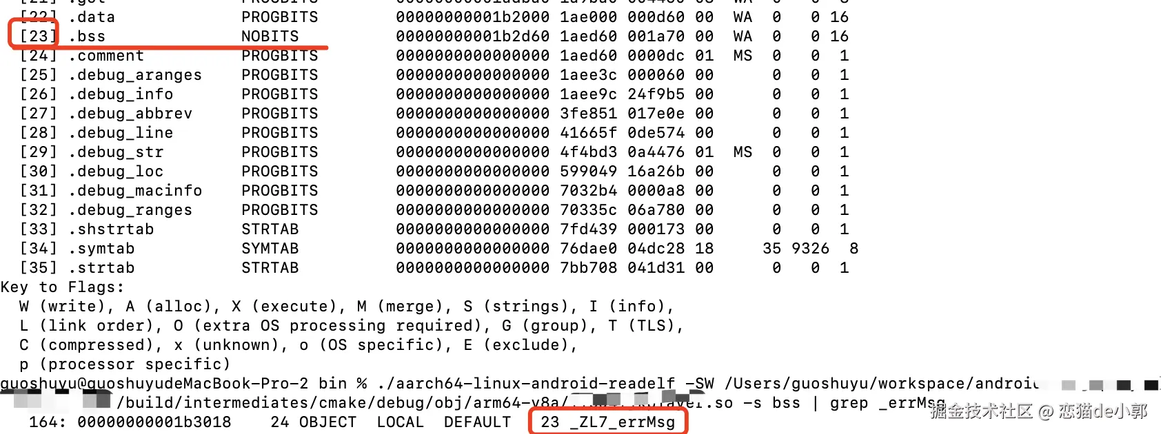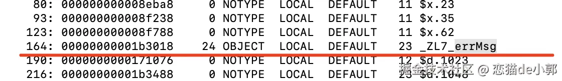 我们可以通过前面的 readelf 工具看一下,如下命令所示 ,通过 -s | grep _errMsg 输出,我们可以看到 _errMsg 确实存在 [23] 的 bss 的 NOBITS 位置。