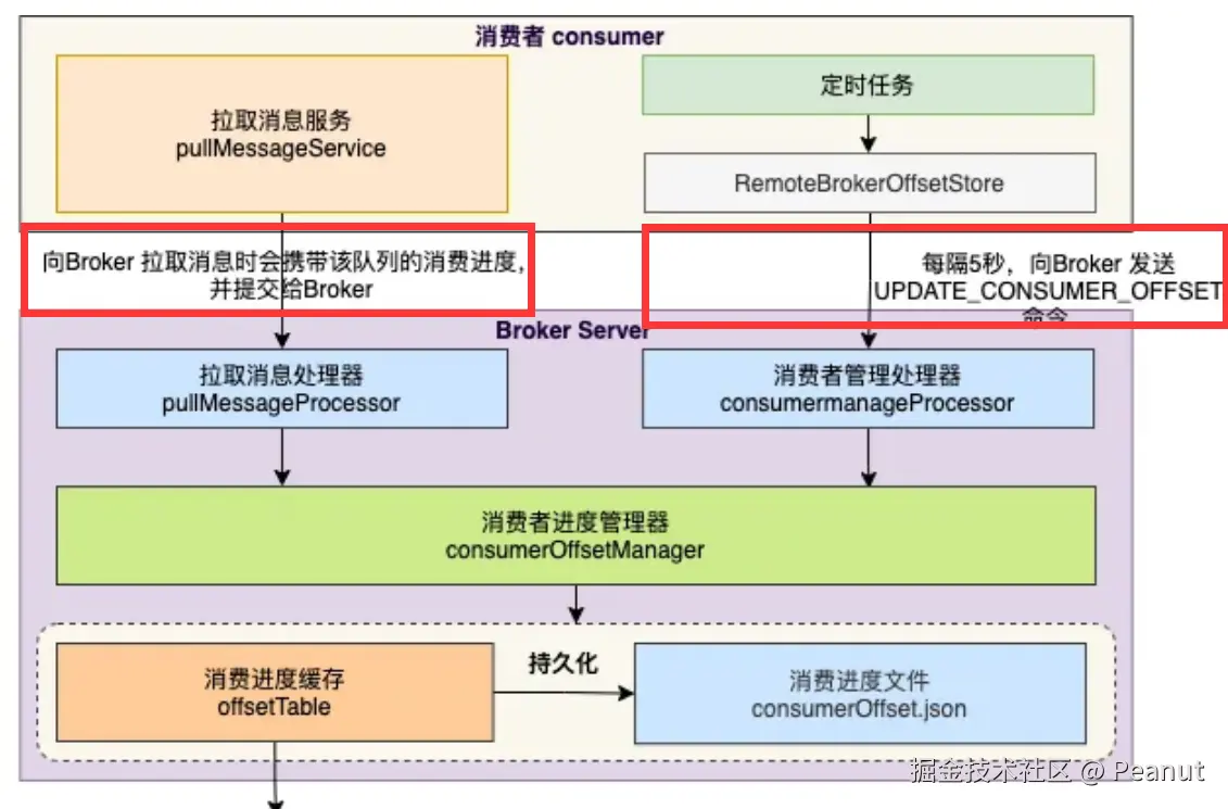 - 拉取消息服务会在拉取消息时,携带该队列的消费进度,提交给 Broker 的拉取消息处理器。
