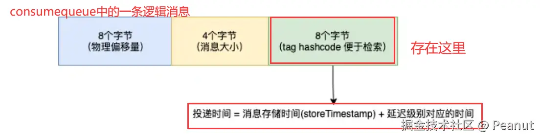 关键,在写入延迟队列的consumeQueue中的时候,会计算这个消息应该被投递的时间,并存储在tag的hashCode中(我们知道consumeQueue中的每个逻辑消息由三个部分组成)。后期定时任务扫的时候,就根据tag的hashcode这个时间判断是否重新投递。