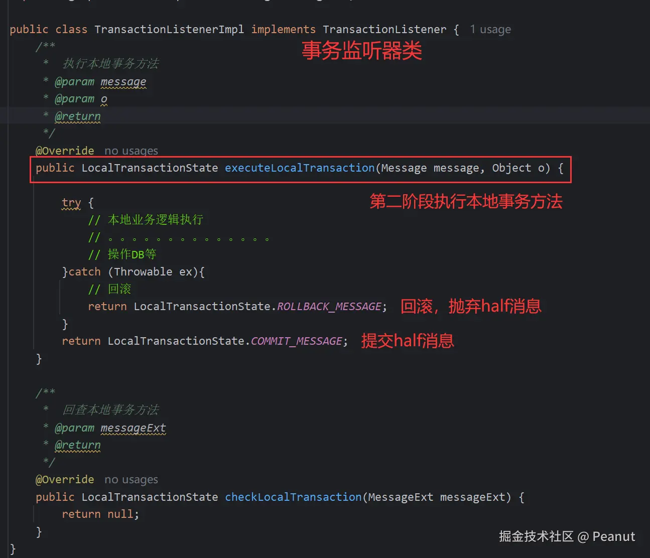 executeLocalTransaction方法,在这个方法中可以执行本地事务(比如业务逻辑,落库相关的操作)。根据方法返回参数判断第二阶段是提交还是回滚。