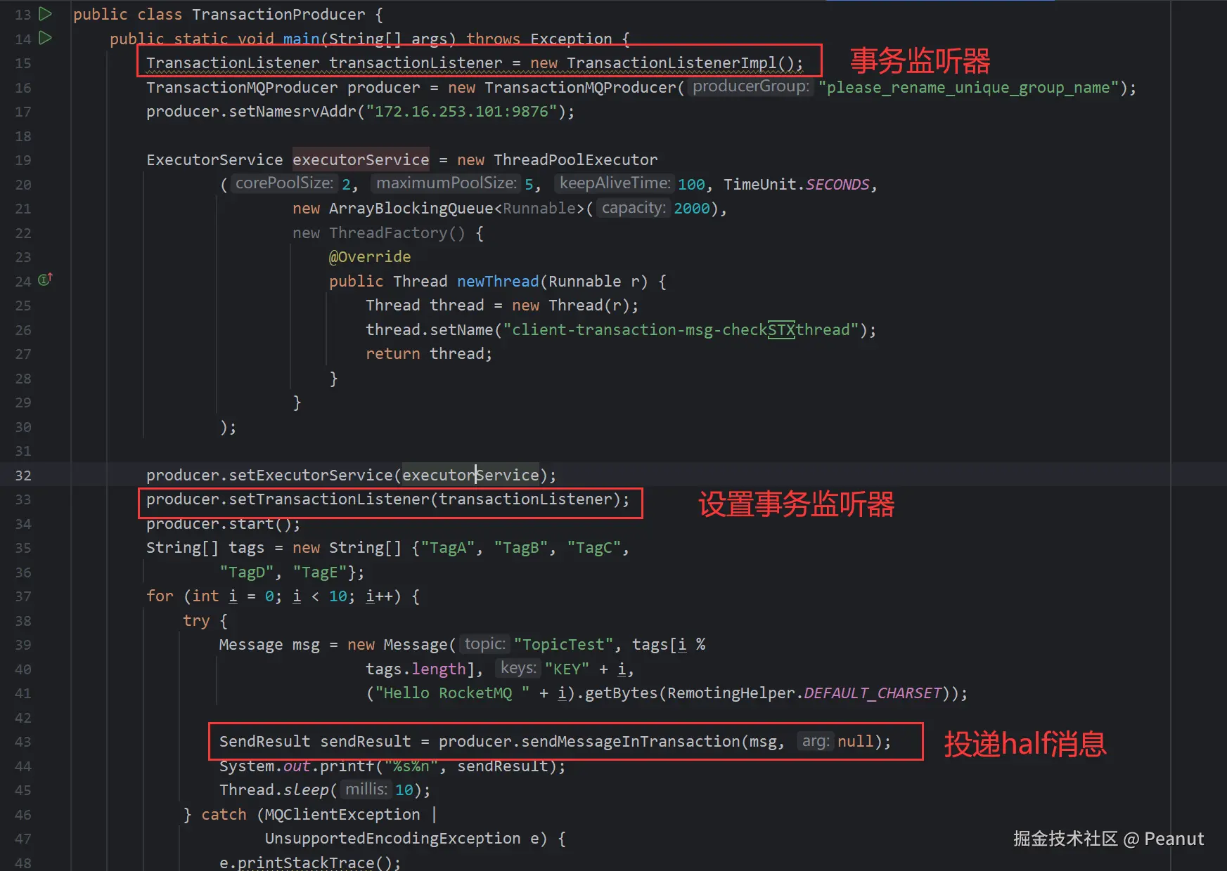 trasactionListener实现类,并且在提交事务时调用sendMessageInTransaction方法。这时producer会给broker发送一个half消息,half消息不会消费者消费。 - 第二阶段。broke收到half消息后会回复并 调用 事务监听器中的