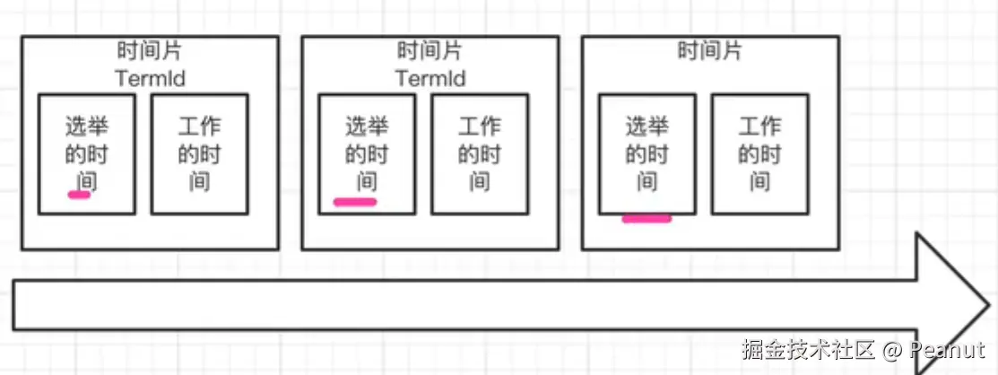 每个时间片走完(时间片内部又划分为选举时间和工作时间),就会重新选举,没有永久的leader。为什么这样,因为这样可以解决脑裂的问题(zk就有脑裂的问题)。