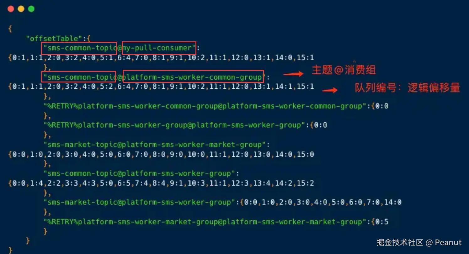 在进度文件 consumerOffset.json 里,数据以 key-value 的结构存储,key 表示:主题@消费者组 , value 是 consumequeue 中每个队列对应的逻辑偏移量 。