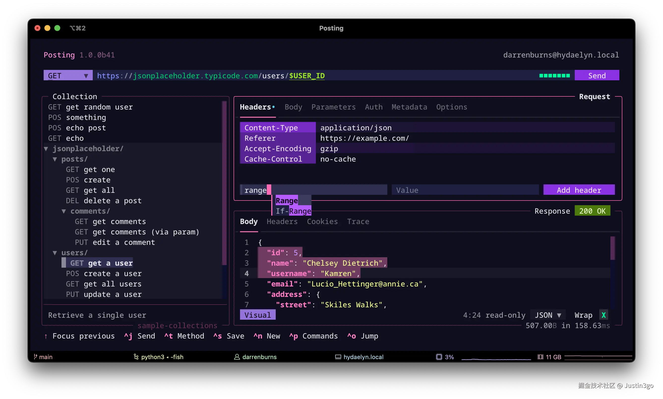 TUI 应用,可通过 SSH 使用,并实现高效的以键盘为中心的工作流程。请求以 YAML 文件存在本地,易于阅读和版本控制。
