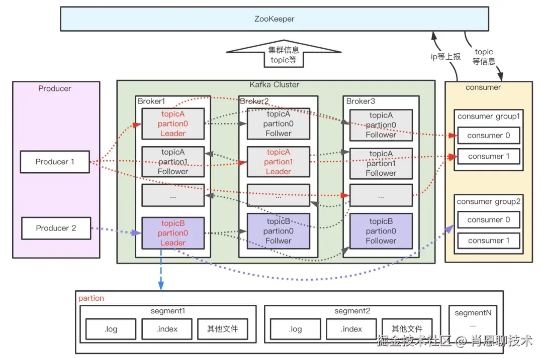 Kafka由Producer、Broker、Consumer和ZooKeeper组成。Producer负责消息的创建和发送;Broker负责消息的持久化和中转;Consumer从Broker拉取并消费消息;ZooKeeper负责集群元数据管理。Kafka通过主题(Topic)、分区(Partition)、分段(Segment)和位移(Offset)等概念,优化了消息处理的并行性和可靠性。