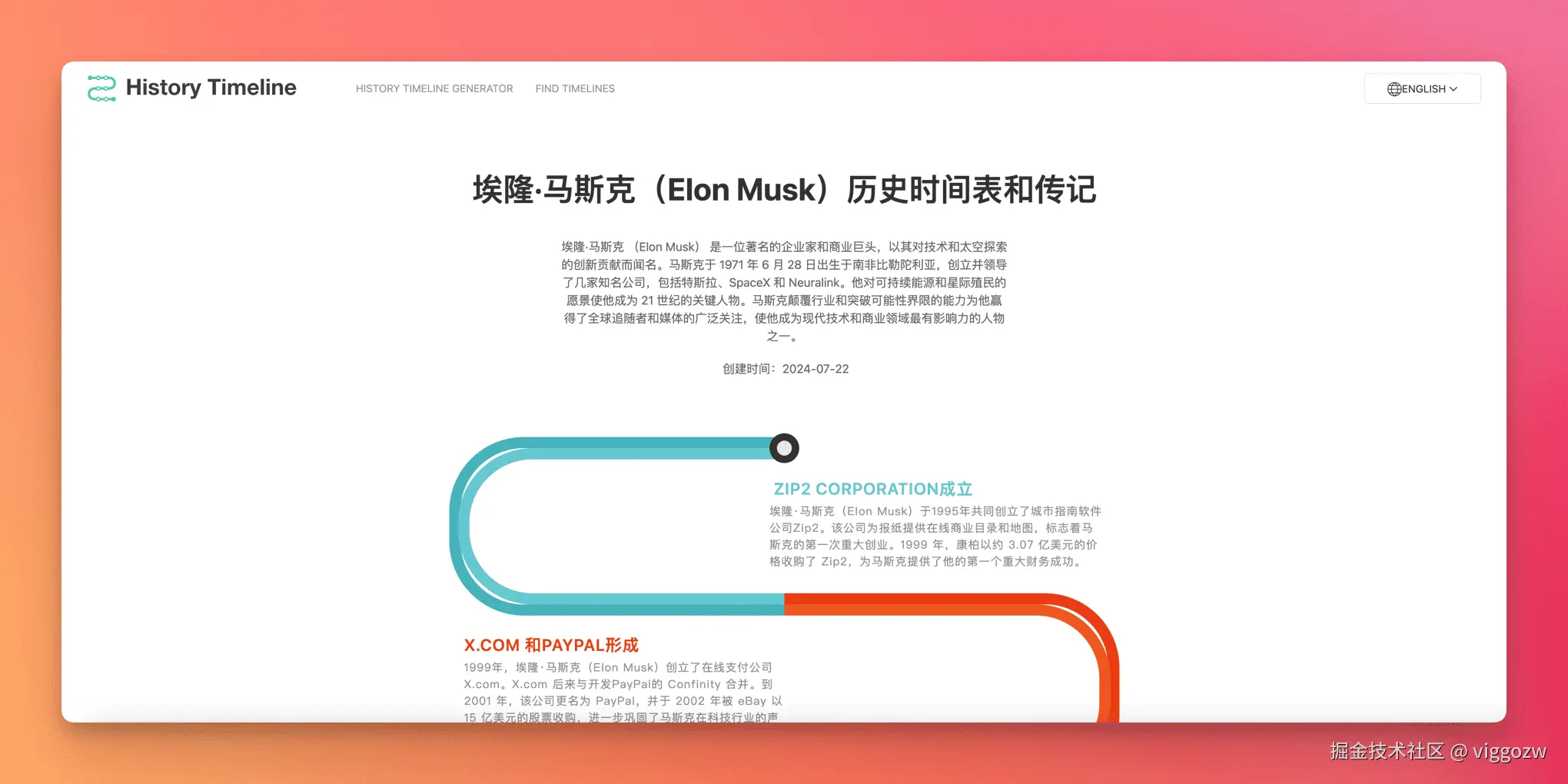 这个网站可以用AI快速创建历史事件的自定义时间线。帮助整理和展示历史事件的发展过程。我测试了一下埃隆•马斯克(Elon Musk)历史时间表和传记,原理估计很简单,但是如果能用图表展示出来,可视化会体验不错,应该还可以做一些其他后续的操作,比如编辑/切换视图排列方式,导出图片,导出PPT等等,可以做增值服务。想法很不错。