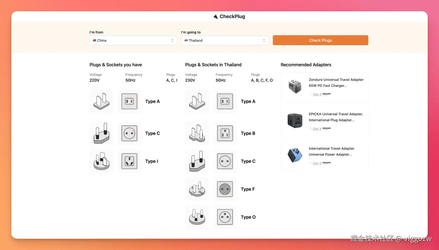 作者@ybhrdwj抓取了 195个国家/地区的电压数据,开发了这个网站,可以告诉你下次旅行需要哪种旅行电源插头,具体开发过程可以看作者的这个推文,使用NextJS + Tailwind,交互非常简单。灵感来自 WhatPlug.info 这个网站,优化了交互和体验,盈利方式是添加了Amazon Affiliate,推荐用户购买获得佣金。